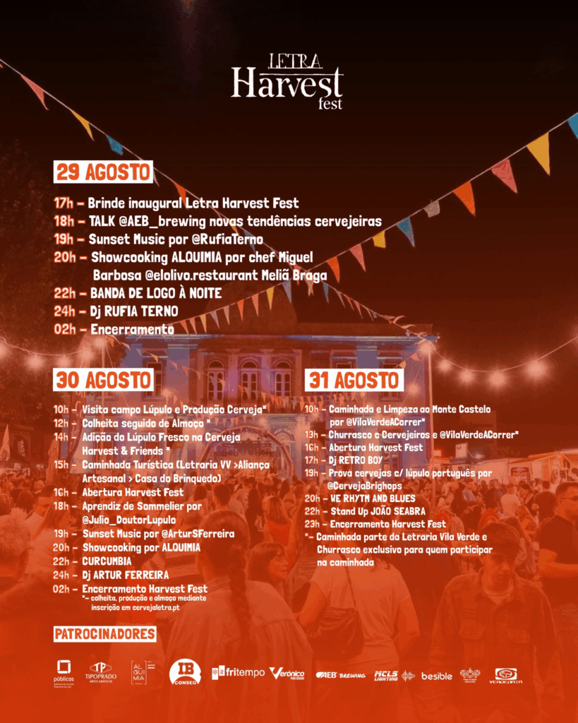 A Praça de Santo António, em Vila Verde, vai transformar-se num grande recinto de festa nos dias 29, 30 e 31 de agosto. O LETRA Harvest Fest 2025 promete três dias de convívio com concertos, oferta gastronómica variada e mais de uma centena de tipos de cerveja para experimentar. A entrada é gratuita e o evento é pensado para todas as idades.
