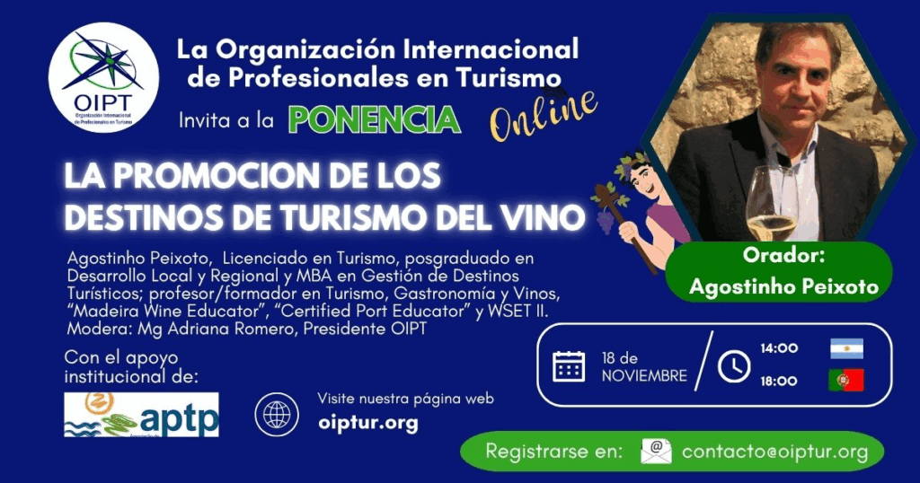 O especialista bracarense Agostinho Peixoto será o orador principal de uma palestra internacional sobre promoção de destinos de enoturismo, marcada para o próximo dia 18 de novembro, às 18h00, numa sessão online promovida pela Organização Internacional de Profissionais de Turismo (OIPT). A participação é gratuita, mediante inscrição via email para contacto@oiptur.org.