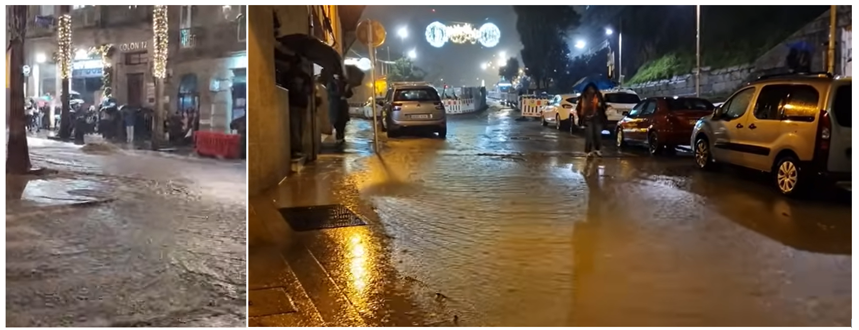 Imagens divulgadas pela TV Galiza mostram vias totalmente alagadas e dificuldades na circulação pedonal, com muitos turistas encurralados pela água acumulada.