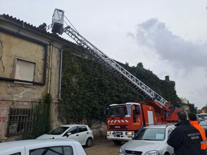 Operacionais da Proteção Civil de Braga e do Batalhão de Sapadores Bombeiros removeram, esta quinta-feira à tarde, um conjunto de telhas e caleiros que apresentavam risco iminente de queda, numa estrutura em ruínas situada na Avenida Imaculada Conceição, junto ao Lidl, na Cividade.