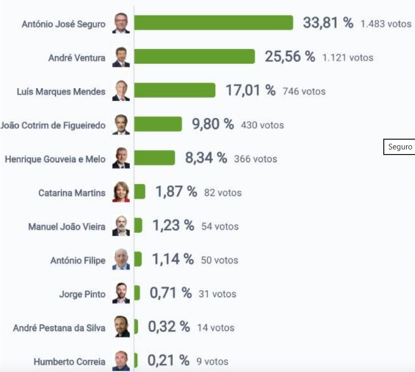 André Ventura surgia na segunda posição, com 26,97%, e Luís Marques Mendes ocupava o terceiro lugar, com 14,82%, segundo dados da Secretaria-Geral do Ministério da Administração Interna – Administração Eleitoral, divulgados às 20:00.