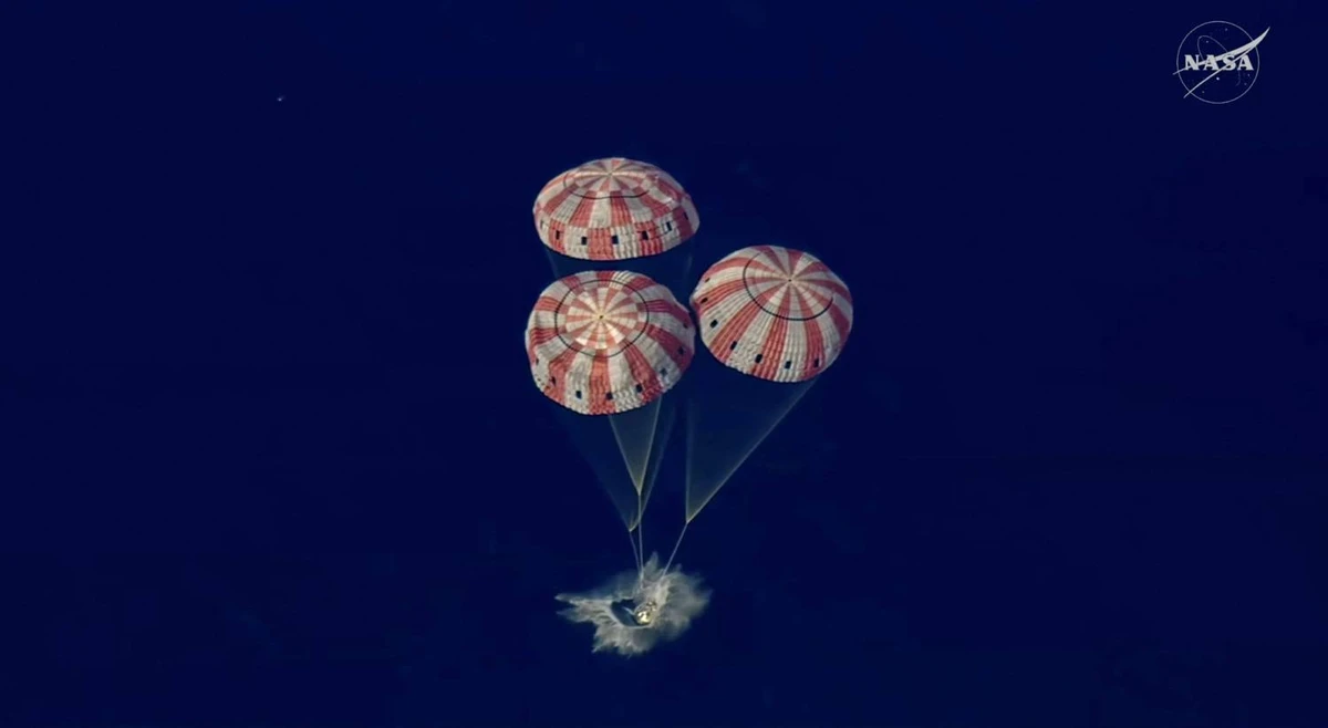 Durante a reentrada na atmosfera, a cápsula enfrentou temperaturas extremas, na ordem dos 2.760 graus Celsius, num processo que durou cerca de 13 minutos e incluiu um período de silêncio nas comunicações devido ao plasma gerado em torno da nave. A descida foi estabilizada com a abertura de paraquedas, permitindo um impacto suave na água.