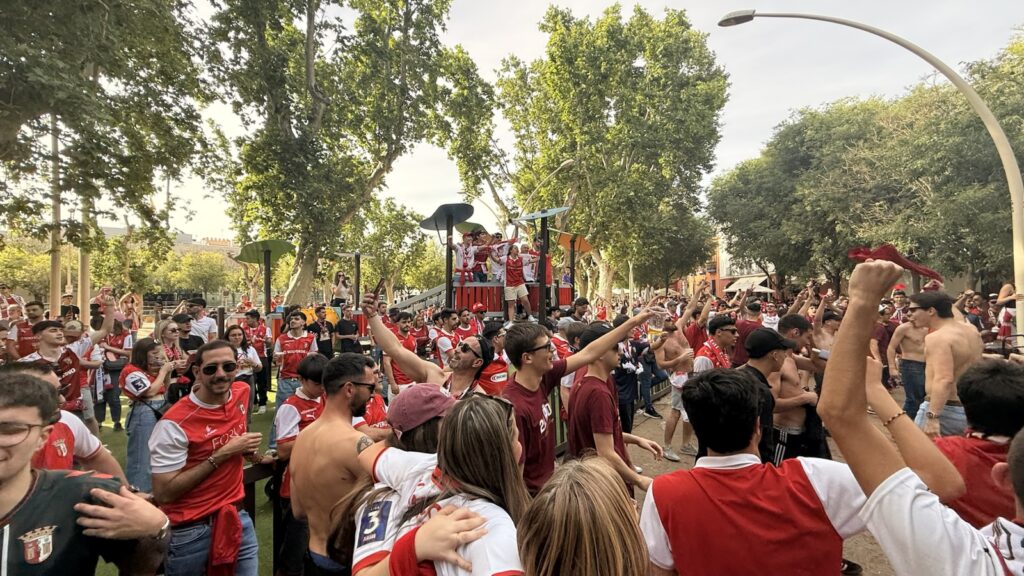 Cerca de 2.000 bracarenses juntaram-se no emblemático espaço da cidade andaluza, num ambiente de grande entusiasmo, com cânticos, convívio e muita cor vermelha a marcar presença.